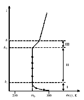 Ярус называют инверсионным слоем. Нижняя граница инверсионного подслоя расположена на уровне . Стратификация атмосферы в инверсионном слое перемешивания устойчива . Ярус , для которого , называют слоем перемешивания. Нижняя граница слоя перемешивания расположена на уровне . Стратификация атмосферы в слое перемешивания нейтральна, а средняя потенциальная температура слоя практически постоянна , .