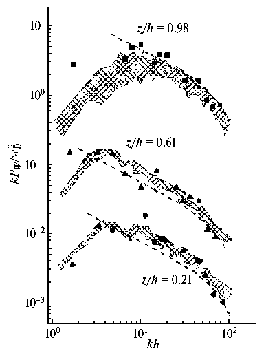 Рис. 2. Нормализованный спектр вертикальной скорости на высотах z/h = 0.21, z/h = 0.61 и z/h = 0.98. Штрихованная область представляет диапазон результатов численного моделирования [Schmidt, Schumann, 1989]. Геометрические символы представляют измерения [Deardorff, Willis, 1985] на различных высотах. Тонкие пунктирные линии соответствуют инерционной части спектра для фильтрованных измерений и пропорциональны k–5/3. Данные умножены на 0.1, 1.0 и 100 для кривых z/h = 0.21, z/h = 0.61 и z/h = 0.98 соответственно.