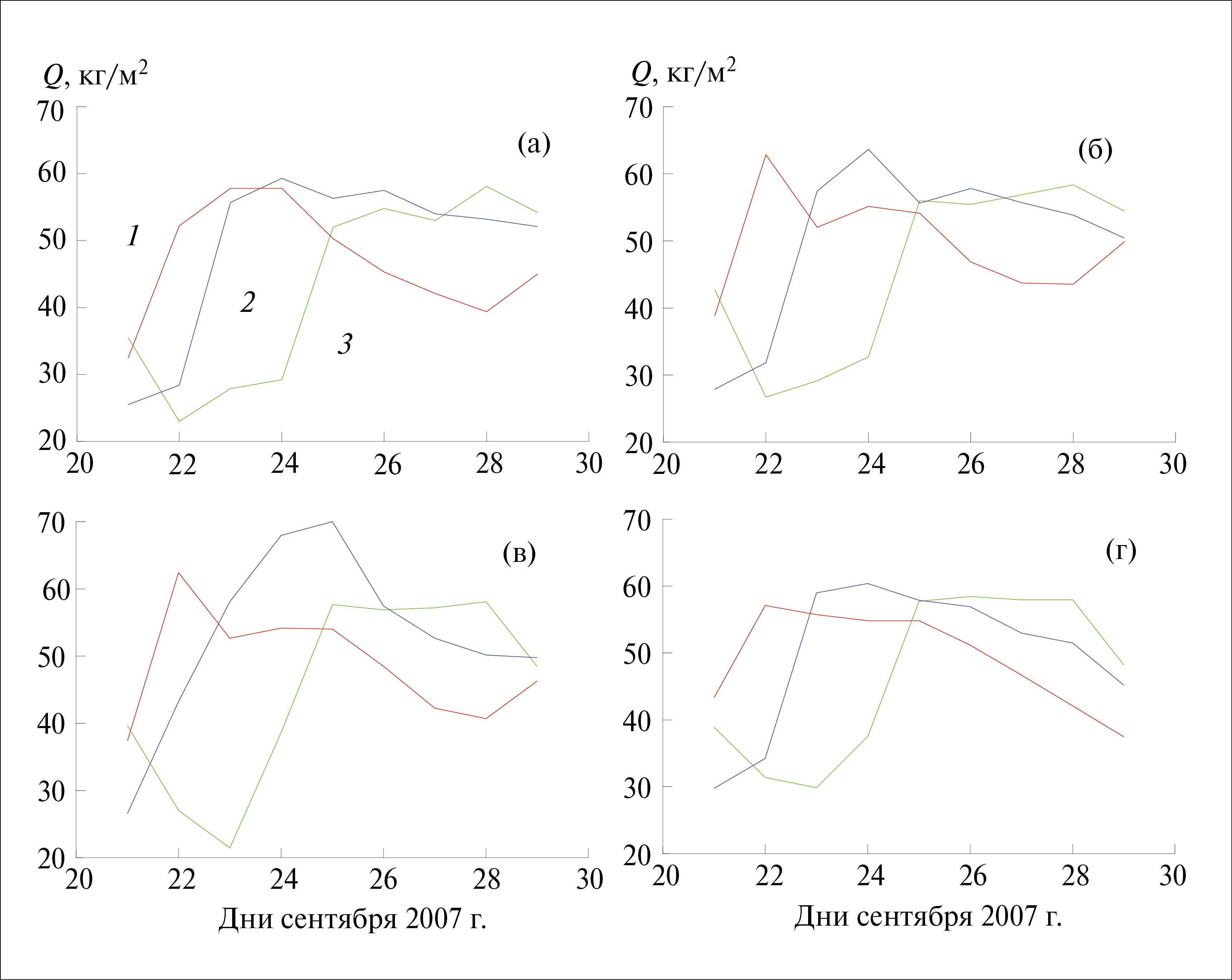 Рис. 1. Динамика ОВА (Q) в период, предшествующий зарождению ТУ Lorenzo в Мексиканском заливе в узлах сетки с координатами долготы 85.5о з.д. (1), 91о з.д. (2), 95.75о з.д. (3) и широты 25о с.ш. (а), 24о с.ш. (б), 23о с.ш. (в), 22о с.ш. (г).