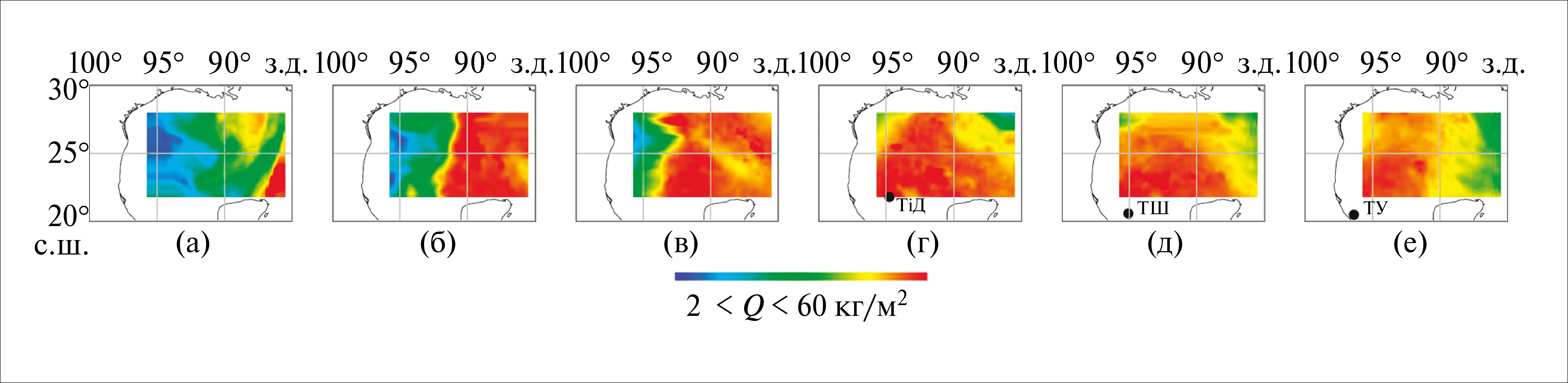 Риc. 2. Динамика изменения поля ОВА (Q) в выбранной области Мексиканского залива в период, предшествующий зарождению ТУ Lorenzo в сентябре 2007 г.: (а) – 22.09; (б) – 23.09; (в) – 24.09; (г) – 25.09; (д) – 26.09; (е) – 27.09. Время прихода тропической волны к Мексиканскому заливу 21 сентября. ТШ – начало стадии тропической депрессии; начало стадии тропического шторма; ТУ – начало стадии тропического урагана [Franklin, 2007].