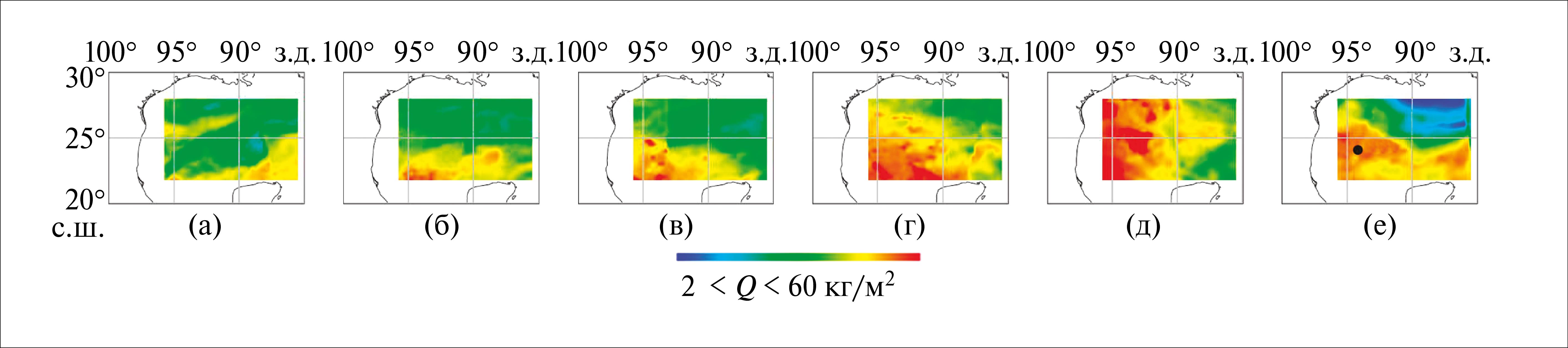 Как видно из рис. 2, приход тропической волны в Мексиканский залив сопровождается появлением области с высоким содержанием водяного пара в атмосфере в его восточной части, перемещающейся на запад и дальнейшей ее локализацией в юго-западной части залива – зоне зарождения урагана Lorenzo.