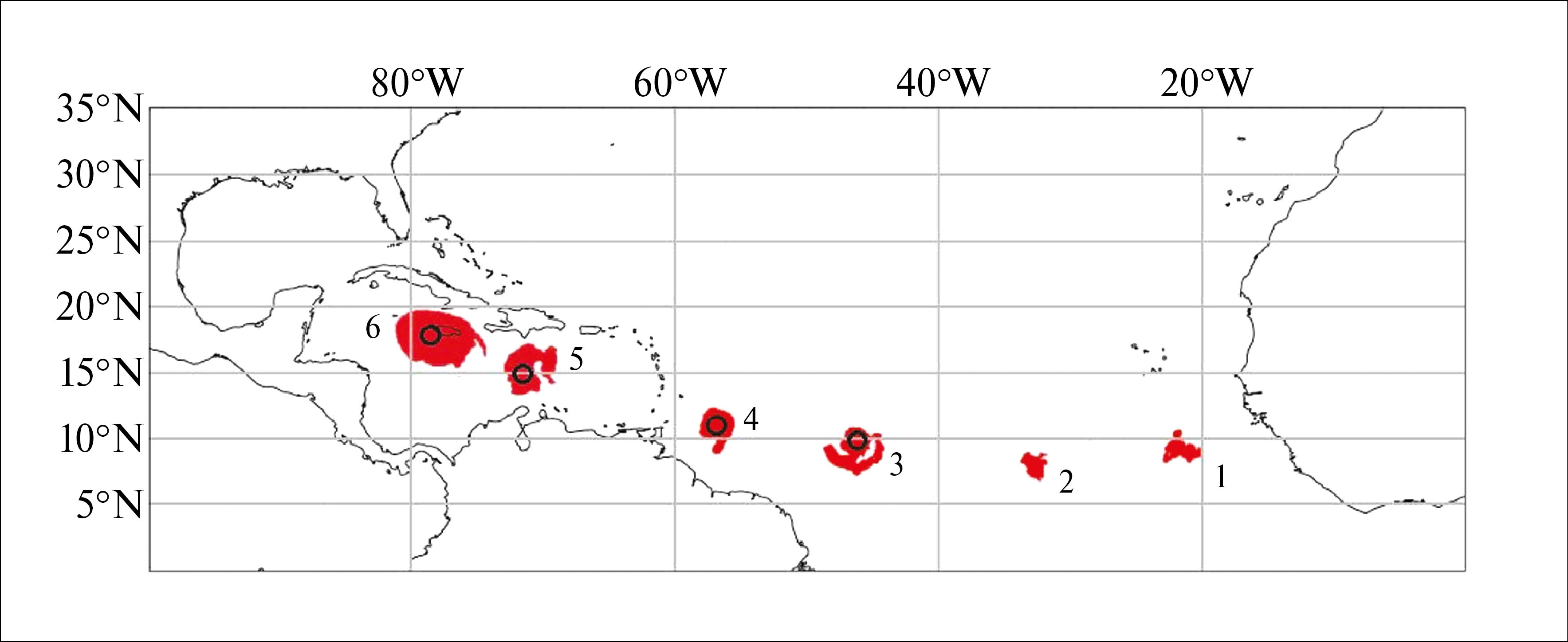 Рис. 5. Трансформация тропической волны в ТУ Ivan, 2004 г.: 1 – 01.09. 2 – 03.09, 3 – 05.09, 4 – 07.09, 5 – 09.09, 6 – 11.09. Выделенные области характеризуются ОВА 60 кг/м2 и выше. Кружки отражают пространственное положение глаза урагана в полуденное время суток. По данным радиометра AMSR-E спутника EOS Aqua.