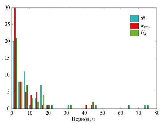 По данным наблюдений в течение двух экспедиционных сезонов нами построена гистограмма значимых периодов (т.е. превышающих спектр “красного шума”) для динамической скорости в приводном слое , среднеквадратичной вертикальной составляющей пульсаций скорости в воде и скорости течения Ud (рис. 2). Мы здесь наблюдаем весьма широкий диапазон периодических процессов от нескольких часов до нескольких суток. Очень похожего вида гистограмма для прибрежных течений в районе г. Геленджика была получена в экспериментах [Зацепин и др., 2012].