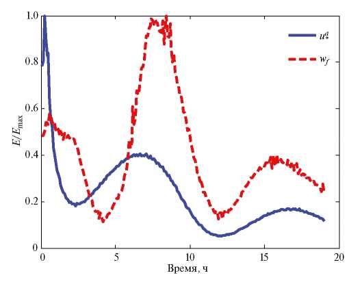Рис. 1. Пример изменения средней по масштабам турбулентной энергии, нормированной на максимальное значение, в пограничных слоях атмосферы и моря 15–16 июня 2007 г.: динамическая скорость в воздухе и среднеквадратичная вертикальная пульсационная скорость wf на глубине 1 м, обработанная фильтром верхних частот с пороговой частотой 1 Гц.