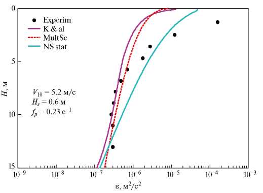 Рис. 4. Скорость диссипации турбулентной энергии: экспериментальные данные и модельные расчеты. Точками обозначены данные эксперимента; K&al. – модель [Kudryavtsev et al., 2008]; MultSc – многомасштабная модель [Чухарев, 2013]; NS stat – нестационарная модель, V10 – скорость ветра на высоте 10 м, HS – высота значительных волн, fp – частота спектрального пика волнения.