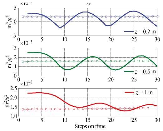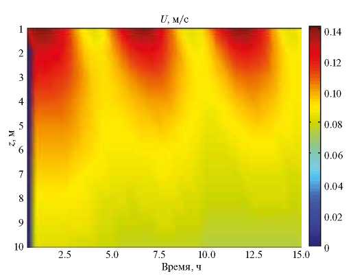 Другие тестовые расчеты по модели приведены на рис. 5, где показано изменение продольной компоненты средней скорости с течением времени при периодическом воздействии касательного напряжения ветра на поверхность. Рассчитанные значения скорости соответствуют физическим представлениям о характере движения в таких условиях: происходит периодическое увеличение компоненты скорости и видно затухание с глубиной. Уменьшение с течением времени глубины проникновения колебаний связано с перераспределением импульса между компонентами. Рассчитанные модельные значения турбулентного потока импульса изображены на рис. 6, где также прослеживается затухание амплитуды колебаний с глубиной и запаздывание во времени с ростом глубины. То есть и в этом случае мы видим физически правильное воспроизведение эволюции гидрофизических характеристик и их поведение на разных глубинах.