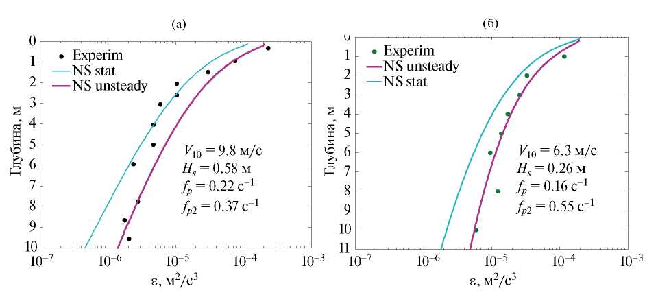 Рис. 7. Отличия в скорости диссипации в модельных расчетах при постоянном и переменном воздействии ветра на поверхность моря одинаковой продолжительности. Точки – экспериментальные значения, NS – нестационарная модель при постоянном (stat) и переменном (unsteady) потоке импульса на поверхности. Измерения выполнены 16 октября 2009 г. (a) и 21 сентября 2015 г. (б).