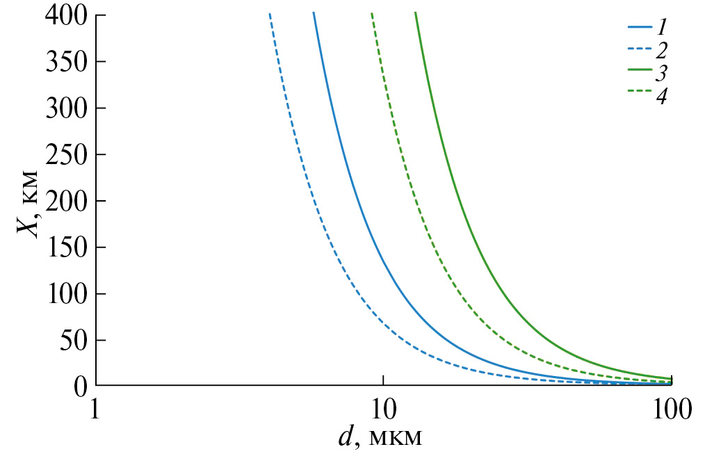 Рис. 1. Расстояние X, пройденное аэрозольными частицами до полного их осаждения на поверхность при скоростях ветра 1 м/с, плотности частиц 2.5 г/см3 (— 1) и 5 г/см3 (---2) и 5 м/с, плотность частиц 2.5 г/см3 (— 3) и 5 г/см3 (---4).