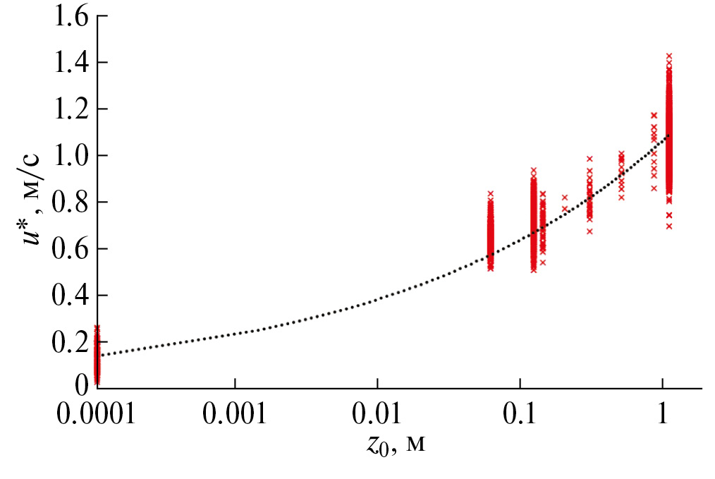 Рис. 2. Зависимость динамической скорости u* от параметра шероховатости z0 в модели WRF-ARW (результаты расчета (Х) и аппроксимация (···) по формуле (2).