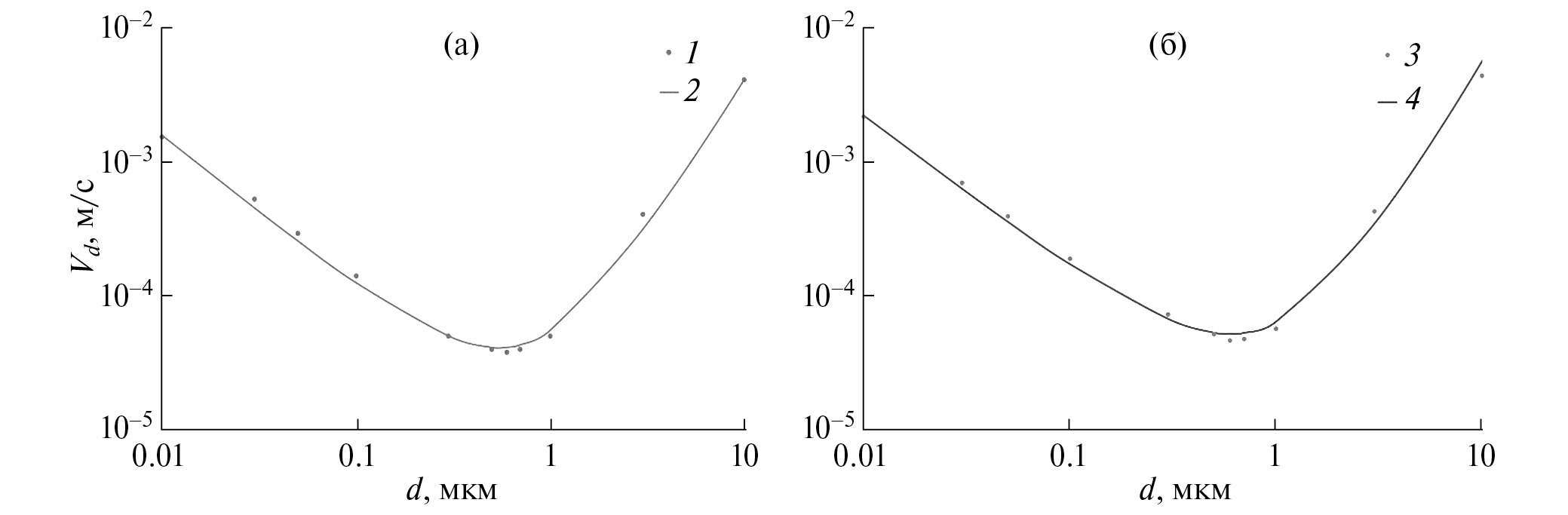 Рис. 3. Результаты оценки скорости сухого осаждения Vd аэрозольных частиц на водную (а) и покрытую снегом поверхности (б), полученные при условиях: 2, 4 – расчет по формуле (7), 1, 3 – данные из [Giardina et al., 2018] при u* = = 0.10 и 0.14 м/с соответственно.