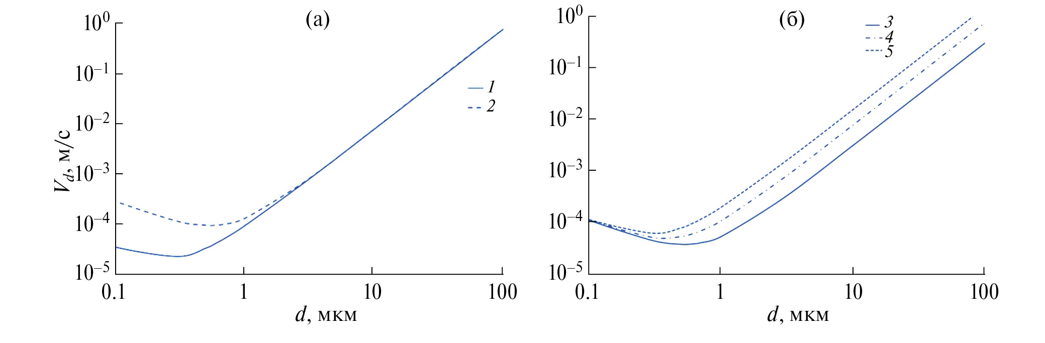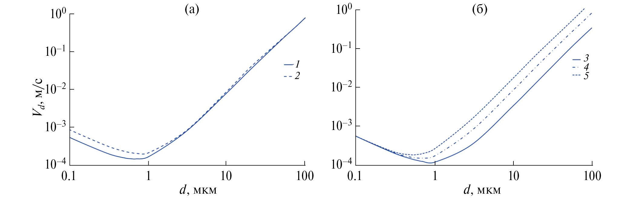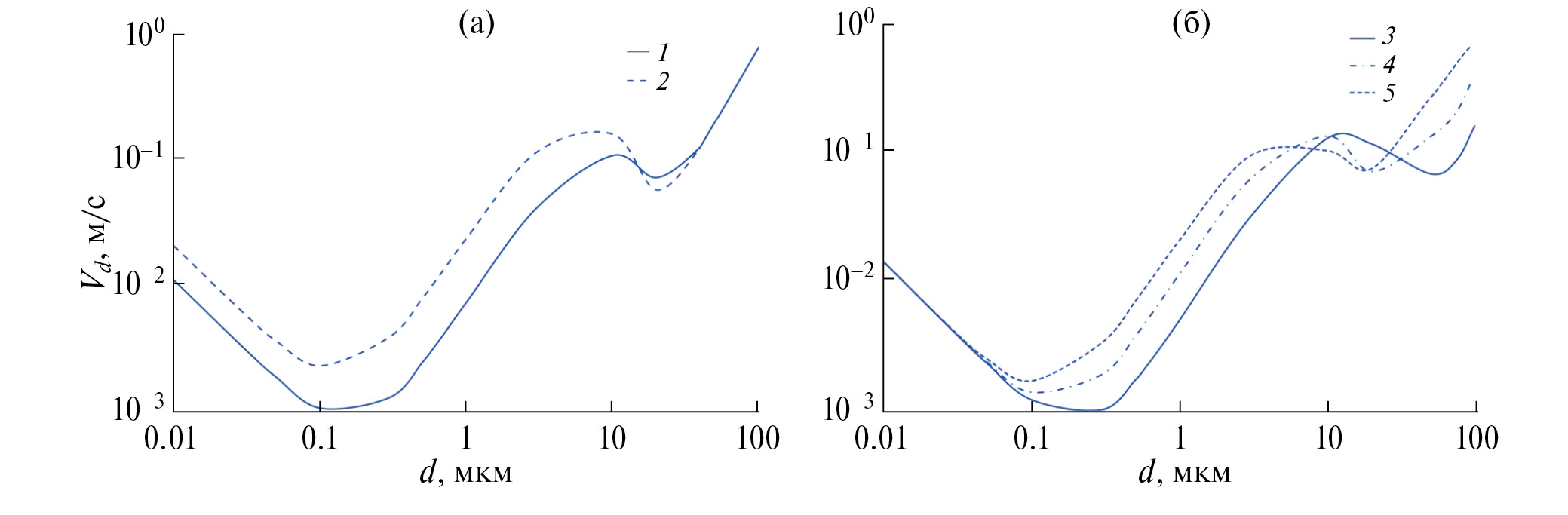 Рис. 6. Скорость сухого осаждения Vd от диаметра частицы d при изменении u* (а) и ρp (б) для поверхности, покрытой снегом (1, 2 – u* = 0.5 и 0.8 м/с для ρp = 2.5 г/см3; 3, 4, 5 – ρp = 1, 2.5, 5 г/см3 для u* = 0.5 м/с).