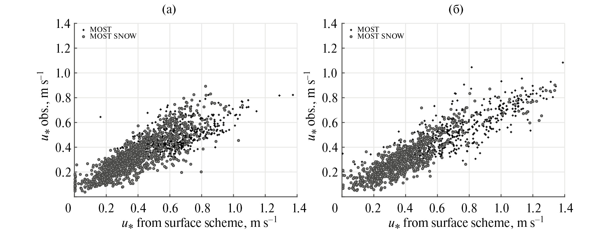 Рис. 1. Диаграммы рассеяния скорости трения рассчитанной по двум сериям (“MOST” и “MOST SNOW”) и измеренной на станции Тикси в 2015 (а) и 2016 (б) гг.