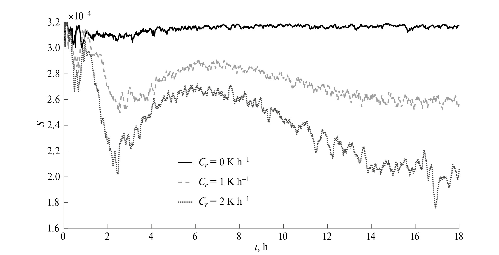 Рис. 2. Изменения приповерхностной объемной концентрации частиц снега для экспериментов с различной скоростью охлаждения поверхности (Сr) на высоте уровня сальтации.