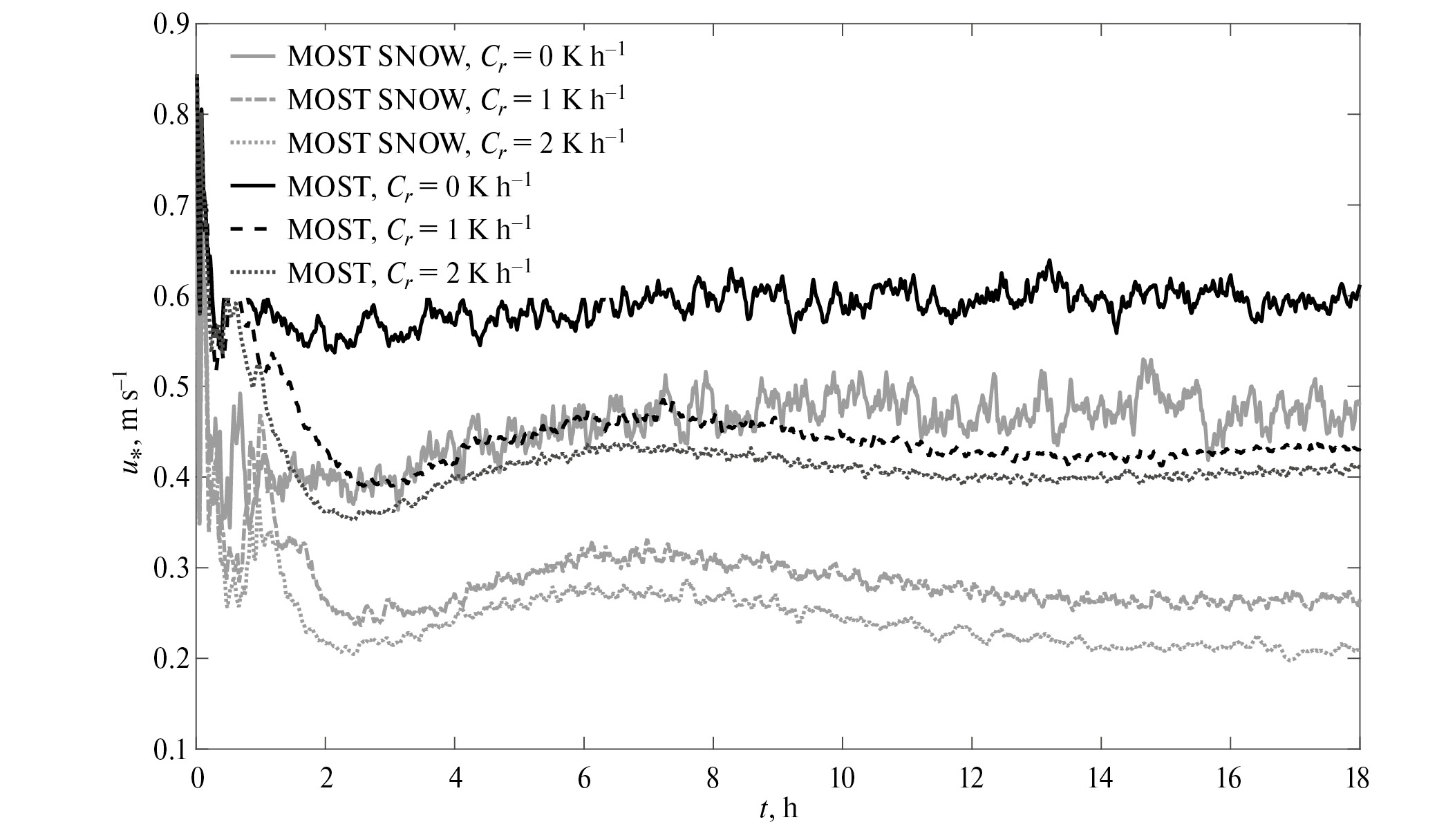 С увеличением скорости выхолаживания поверхности устойчивость также возрастает, а концентрация частиц уменьшается, так как концентрация пропорциональна скорости трения. Увеличение выхолаживания поверхности приводит к повышению устойчивости в приземном слое, что приводит к уменьшению скорости трения (рис. 3). Аналогичный эффект увеличения устойчивости наблюдается и при добавлении взвешенных частиц снега (серые кривые). Без включения частиц и без охлаждения динамическая скорость имеет максимальное значение (черная сплошная линия). Включение частиц снега снижает динамическую скорость примерно на 0.1 , такой масштаб изменения динамической скорости соответствует эффекту увеличения скорости выхолаживания поверхности на 1 к ⋅ ч–1. Минимальные значения динамической скорости наблюдаются при учете влияния как температурной стратификации, так и стратификацией, обусловленной наличием снежных частиц.