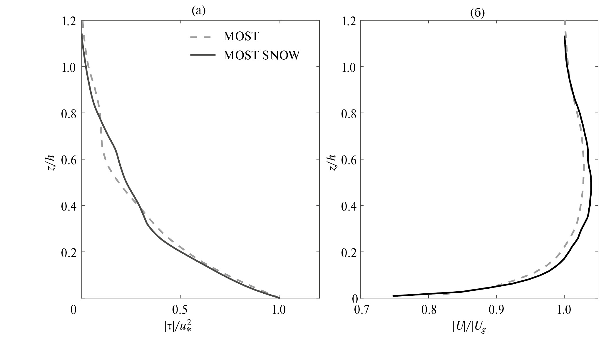 Рис. 5. Профили скорости ветра (б) и потока импульса (а), в экспериментах с наличием “MOST SNOW” и отсутствием “MOST” взвешенных снежных частиц.