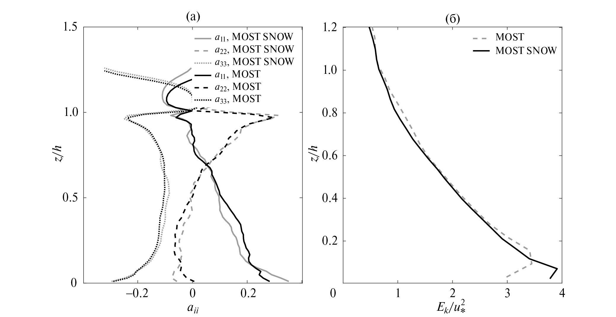 Рис. 6. Компоненты тензора анизотропии Рейнольдса (а) и нормированных профилей ТКЭ (б), осредненных за 9-й час моделирования в экспериментах при наличии (“MOST SNOW”) и при отсутствии (“MOST”) взвешенных частиц снега.