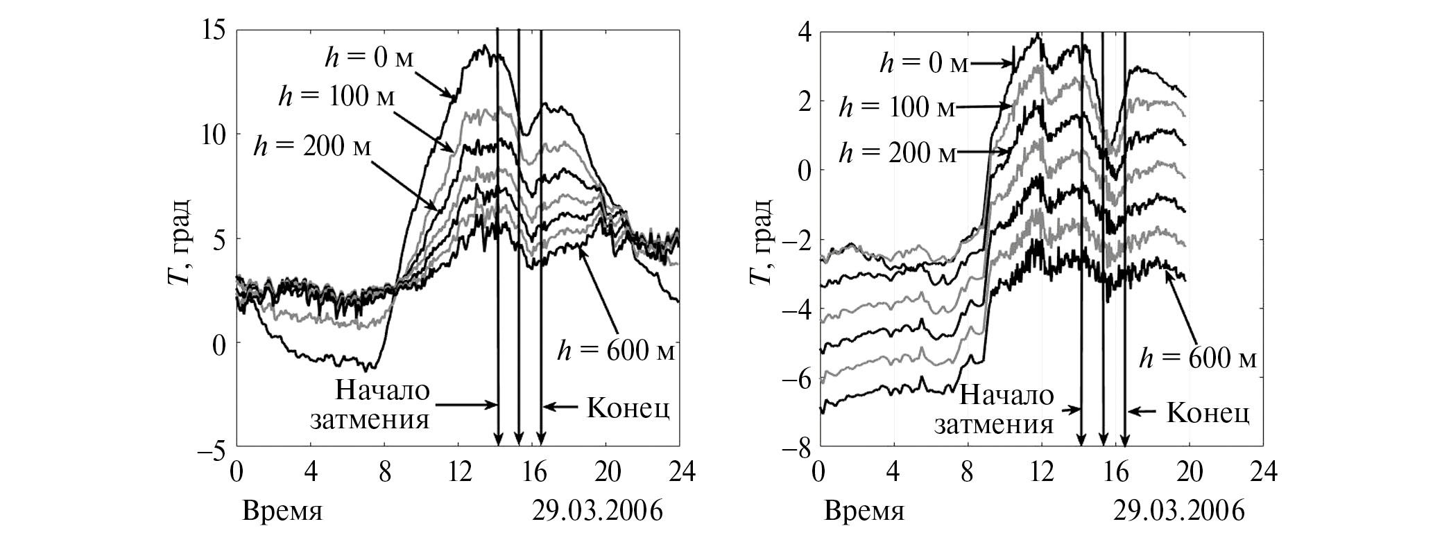 Колебания температуры воздуха, записанные при помощи профилемера во время солнечного затмения 29 марта 2006 года для высот: 0–600 м в городе Кисловодске – левая панель – и на ВНС – правая панель, – показаны на рис. 1 с шагом по высоте 100 м.