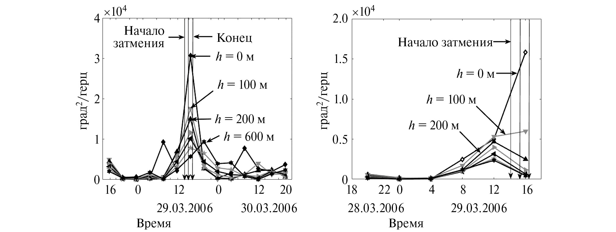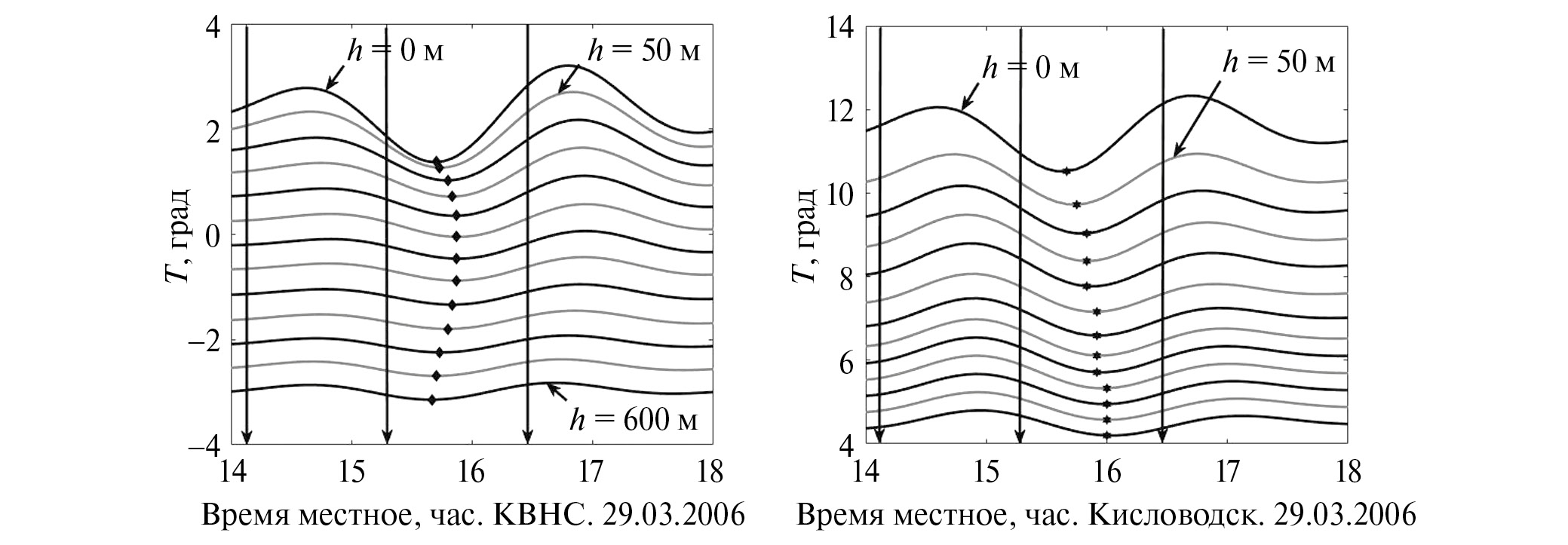 На рис. 6 показаны колебания температуры воздуха на временном отрезке 14–18 ч 29.03.2006, после вычета трендов с помощью полиномов 2-й степени и фильтрации в пределах диапазона периодов 1 ч 26 мин – 4 ч 16 мин. Маркерами отмечены положения минимумов температуры воздуха, вызванных солнечным затмением, в зависимости от высоты и времени для профилей температуры, полученных на ВНС (левая панель) и в Кисловодске (правая панель), для высот 0–600, шаг 50 м.