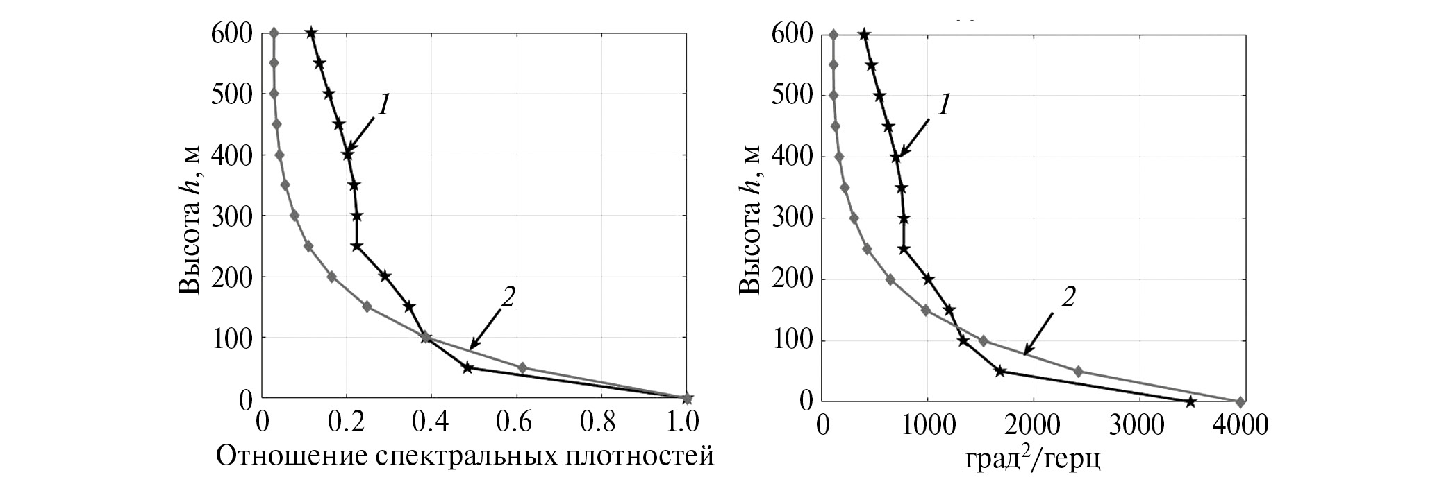 На рис. 3 для временного отрезка от 14 до 18 ч 29.03.2006 г., в котором произошло солнечное затмение, показаны зависимости отношений спектральных плотностей колебаний температуры воздуха к спектральным плотностям на нулевой высоте (левая панель) и зависимости спектральных плотностей от высоты (правая панель), в диапазонах периодов 1 ч 42 мин – 3 ч 12 мин, для высот от 0 до 600 м с шагом 50 м над уровнем земной поверхности в Кисловодске – 1 и ВНС – 2.