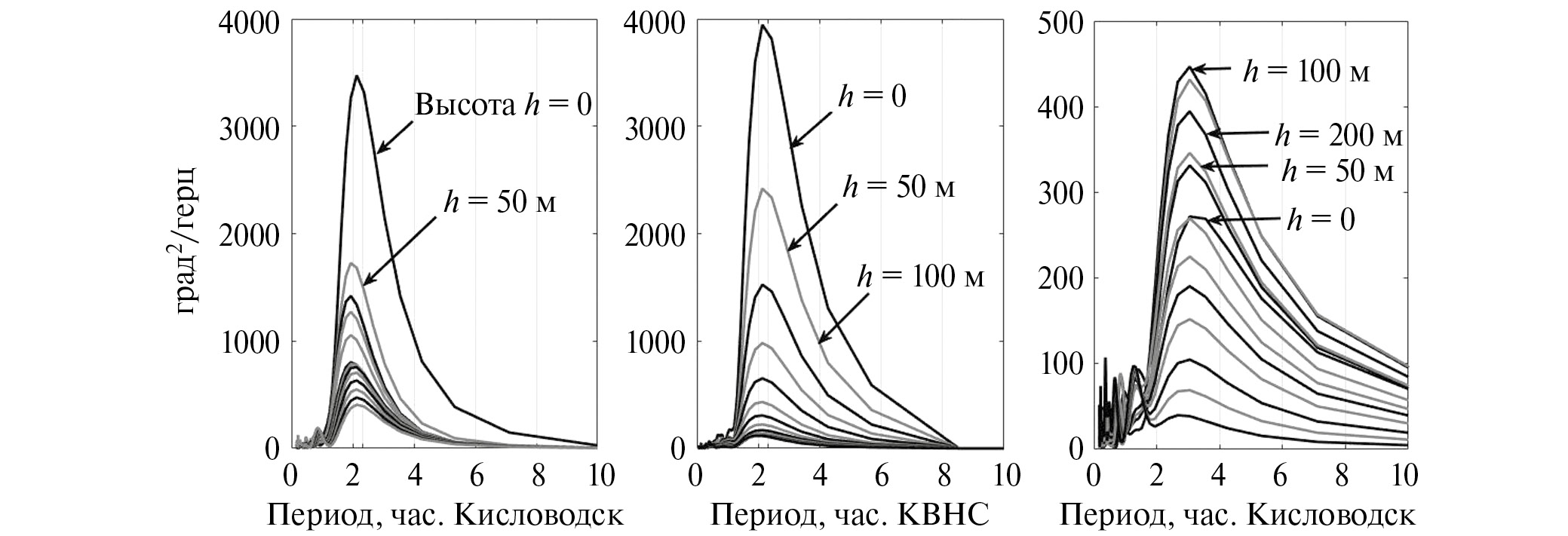 Из рис. 3 видно, что выше 100 м спектральная плотность температуры воздуха для периодов, соответствующих длительности затмения, равной 2 ч 20 м, на ВНС убывает сильнее, чем в г. Кисловодске. Разная скорость убывания спектральной плотности колебаний температуры воздуха с высотой определяется разным влиянием турбулентного перемешивания воздушных масс в пограничных слоях г. Кисловодска и высокогорной станции ВНС. Так, спектральная плотность колебаний температуры воздуха на высоте 600 м на ВНС уменьшилась в 33.8 раз, а в городе Кисловодске – в 8.5 раз по сравнению со значениями на уровнях земной поверхности.
