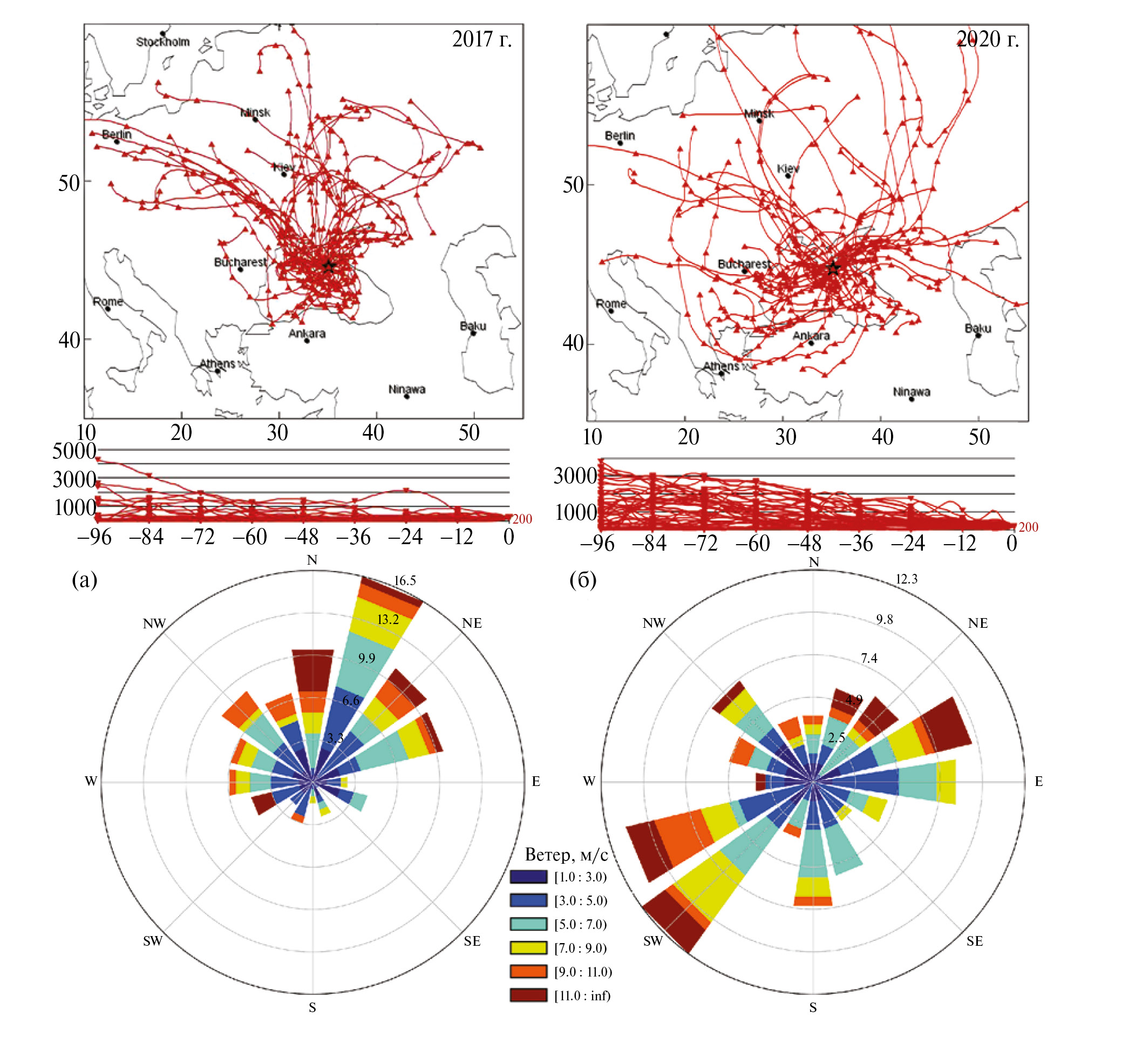 На рис. 4 представлены обратные траектории движения воздушных масс, полученные с помощью модели NOAA HYSPLIT на высоте 200 м (местное время 12:00, продолжительность траекторий 96 ч), а также розы ветров и распределение скорости ветра на основе метеополей реанализа ERA5 на уровне 900 мбар для 2017 (рис. 4а) и 2020 гг., (рис. 4б) в период 15 мая – 30 июня. В данном случае целесообразность использования метеополей реанализа ERA5 на уровне 900 мбар (что соответствует примерно 1000 м над уровнем моря) для построения роз ветров обусловлена тем, что район наблюдений характеризуется крайне сложным режимом ветровой нагрузки, и станционные данные о приземном ветре не полностью отображают региональную картину. Это в первую очередь связано с расположением станции на склоне у моря в горном районе со значительным перепадом высот. Заметим, что максимальная высота горы Святая, на северо-восточном склоне которой расположена СФЭМ, составляет 577 м, и это не единственная вершина в округе.