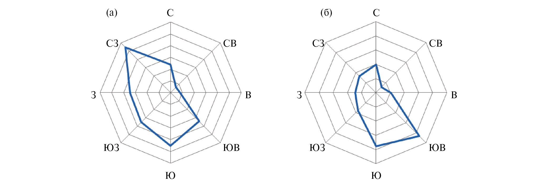 Рис. 5. Розы ветров, 2016–2021 гг.: а – все значения; б – для случаев с концентрацией O3 выше 100 мкг/м3.
