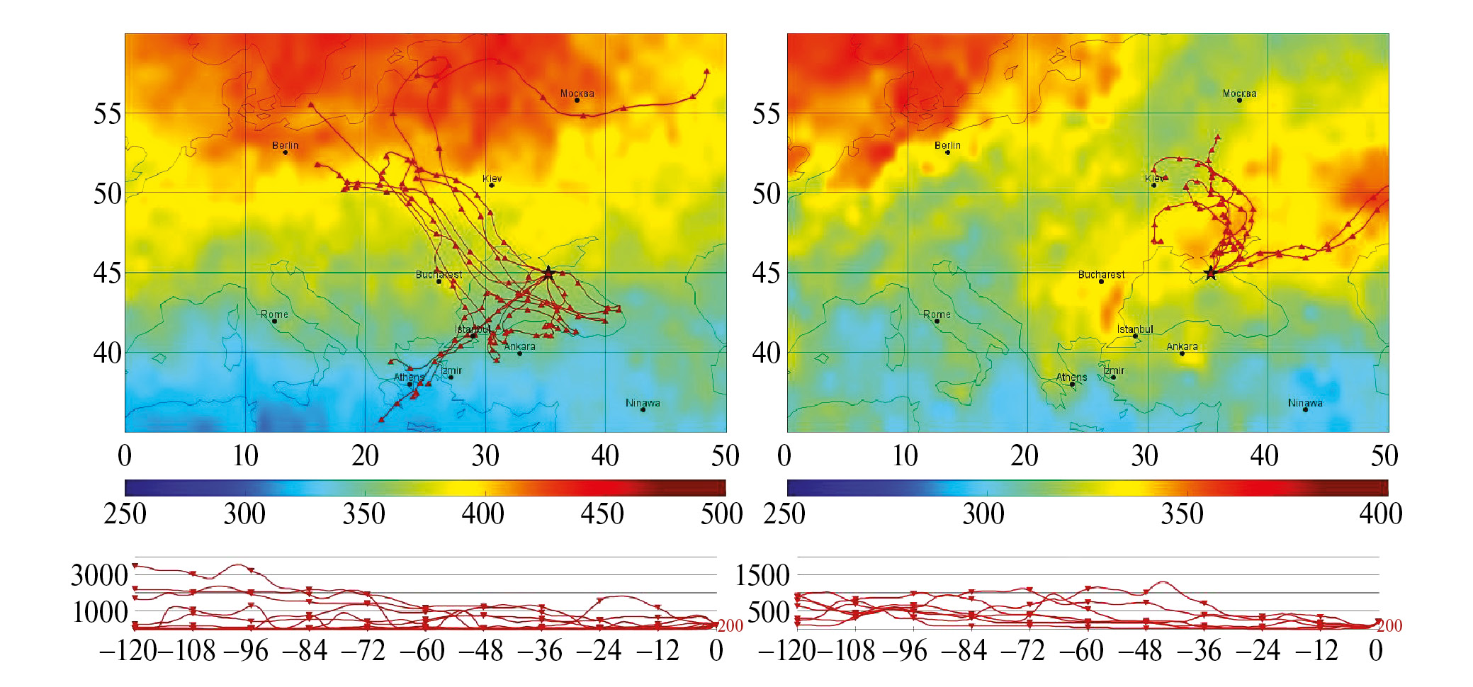 Траекторный анализ показал, что для случаев превышения норматива весной движение воздушных масс происходит над акваторией Черного моря, преобладает атмосферный перенос с северного–северо-западного направлений со стороны центральной Украины, Турции, Румынии и Болгарии; в летние месяцы преобладает перенос над сушей с восточного направления (Украина, юг России).