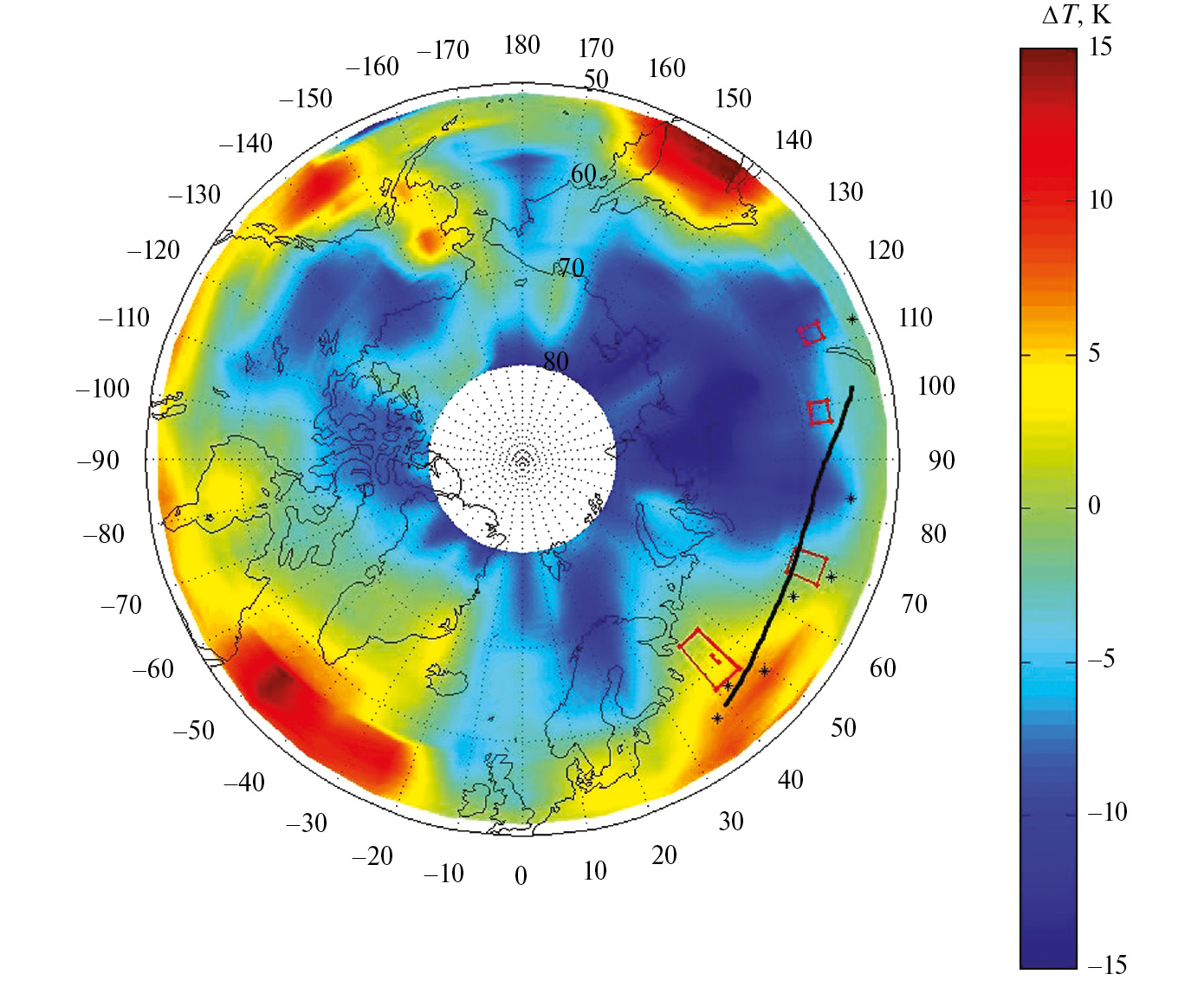 Рис. 2. Зафиксированные наземной и самолетной фотосъемкой 13 июня 2021 г. (UT 17:00÷23:30) поля С.О. (красные прямоугольники) на фоне карты разностей температуры и точки замерзания на барическом уровне 0.0046 гПа (~85 км), построенной по данным прибора MLS спутника Aura. Наземные пункты, где наблюдались С.О. либо отмечено их отсутствие при благоприятных погодных условиях, показаны черными звездочками. Часть траектории ПС, проходившая в сумеречных или ночных условиях выше тропосферной облачности, показана жирной черной линией.