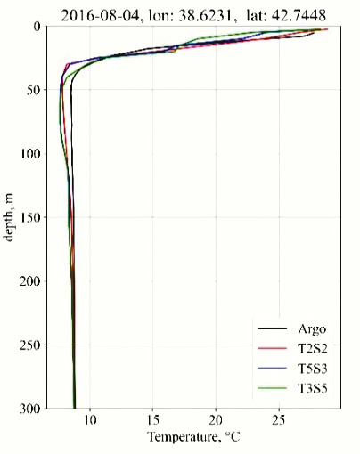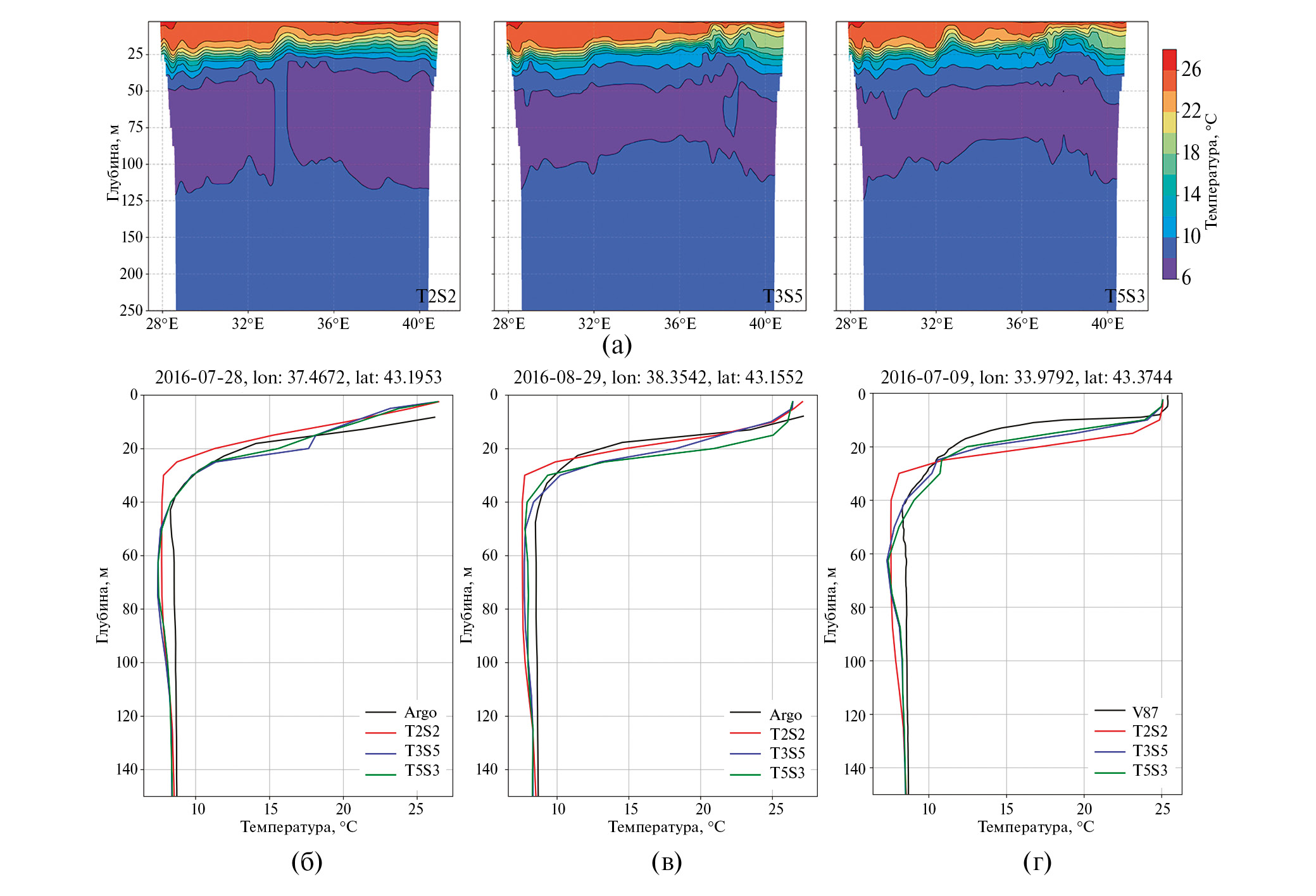 Наиболее важные на наш взгляд различия, обнаруженные в результатах моделирования поля температуры, – это толщина сезонного термоклина и толщина ХПС. В центральной части моря в экспериментах T3S5 и T5S3 с середины июня по конец сентября слой скачка температуры и слой ХПС тоньше, чем в T2S2. В качестве примера на рис. 7а показаны вертикальные разрезы температуры вдоль 43˚ с.ш. в июле. Как видно в окрестностях горизонта 25 м наблюдается сгущение изотерм в расчетах T3S5 и T5S3, а толщина ХПС в среднем менее 50 м. Анализ натурных данных за 2016–2019 гг. [Морозов и др., 2020] показывает, что в Черном море наблюдается поднятие нижней границы ХПС. По сведениям, представленным в монографии [Иванов и др., 2011], максимальная величина среднего для летнего сезона вертикального градиента температуры, характеризующего слой скачка, равна –1.4˚С/м. Средние за июль оценки величины вертикального градиента модельной температуры в слое 20–25 м для глубоководной части моря (мористее изобаты 1500 м) составляют –1.03, –1.23, –1.34˚С/м для первого, второго и третьего экспериментов соответственно. Анализ профилей температуры по данным ARGO (рис. 7б, в) и глубоководных станций рейса № 87 НИС “Профессор Водяницкий” (рис. 7г) вблизи 43˚ с.ш. указывает на то, что эксперименты T3S5 и T5S3 качественно и количественно точнее воспроизводят форму и толщину ХПС. Как видно из рис. 7б–г результаты расчетов T3S5 и T5S3 находятся в лучшем соответствии с наблюдениями в слое 25–50 м.