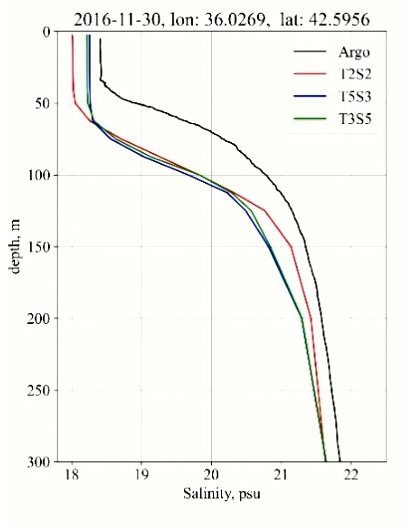 В поле солености зимой (табл. 2) наибольшие RMSE для всех экспериментов наблюдается в слое 30–100 м в районе свала глубин (рис. 1а, рейсы 91, буи 6901832, 6901833) и слое 100–300 м в глубоководной части моря (рис. 1а, буи ARGO 3901852, 3901854, 3901855, 6900807, 6901831), что связано с отличиями в глубине залегания верхней границы основного галоклина: как видно из поведения профилей, приведенных в табл. 2, для всех станций измерений характерна меньшая толщина верхнего перемешанного слоя, чем по данным моделирования. При этом результаты экспериментов T3S5 и T5S3 показывают более близкие к реальности величины солености, что отражается в величине RMSE солености для верхнего 100-метрового слоя. Наименьшие отклонения модельной солености для всех экспериментов наблюдаются для юго-западной части моря (рис. 1а, буи ARGO 3901852, 3901854, 3901855) – района с интенсивной струйной динамикой и слабой вихревой изменчивостью в зимний период. Для остальных районов в слое 30–100 м RMSE солености, полученной в экспериментах T3S5 и T5S3, меньше примерно на 20%, чем по данным T2S2, а в слое 100–300 м – наоборот, на 15% больше (табл. 2).