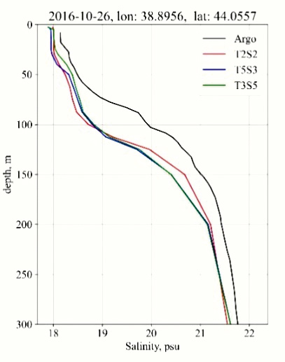 Как было показано выше, значимые отличия в результатах моделирования температуры и солености наблюдаются в верхнем 300-метровом слое. Анализ пространственных распределений поля солености на различных горизонтах показал, что разница в интенсивности циркуляции проявляется начиная с глубин примерно 75 м с конца весны. В экспериментах T3S5 и T5S3 в центральной части моря наблюдаются области повышенной солености по сравнению с T2S2 (рис. 5а), что свидетельствует об усилении подъема вод. Такая картина прослеживается до конца осени. Из рис. 1б видно, что летом в глубоководной части моря находились буи ARGO № 6901831 и 6901900. Для восточной части моря сопоставление с данными буя 6901831, двигавшегося на северо-восток, демонстрирует уменьшение ошибки в результатах экспериментов T3S5 и T5S3 (рис. 5б), когда буй переместился севернее 43˚ с.ш. в область с наибольшей разницей между экспериментами (рис. 5а). Так, анализ разницы между модельными и натурными данными для лета 2016 г. показал, что величины mean S составили 1.36, 1.22, 1.25‰ для экспериментов T2S2, T3S5, T5S3 соответственно. Отклонение солености вдоль траектории буя 6901900 свидетельствует, что в западной части моря (рис. 1а) эксперимент T3S5 дает наименьшую ошибку (рис. 5в): величины mean S составили 1.62, 1.28, 1.57‰ для экспериментов T2S2, T3S5, T5S3 соответственно. Профили солености вдоль траекторий буев демонстрируют, что уменьшение ошибки моделирования солености в центральной части связано с более точным воспроизведением верхней границы основного галоклина в экспериментах T3S5 и T5S3 (рис. 5г, д).