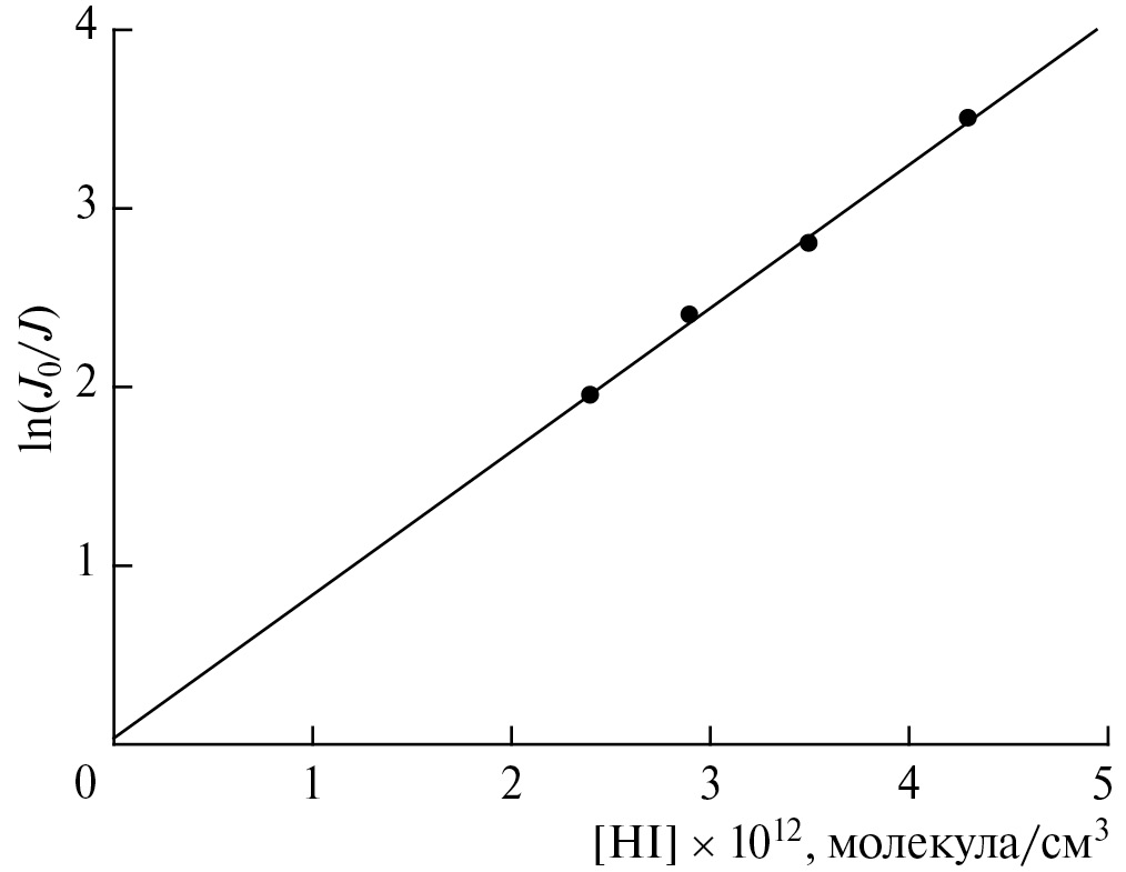 Рис. 2. График зависимости ln(J0/J) от концентрации [HI]. (T = 298˚K, P = 1.1 Торр, время реакции 0.0083 с. Разбавителем служил гелий. Измерялся сигнал РФ атома хлора.)