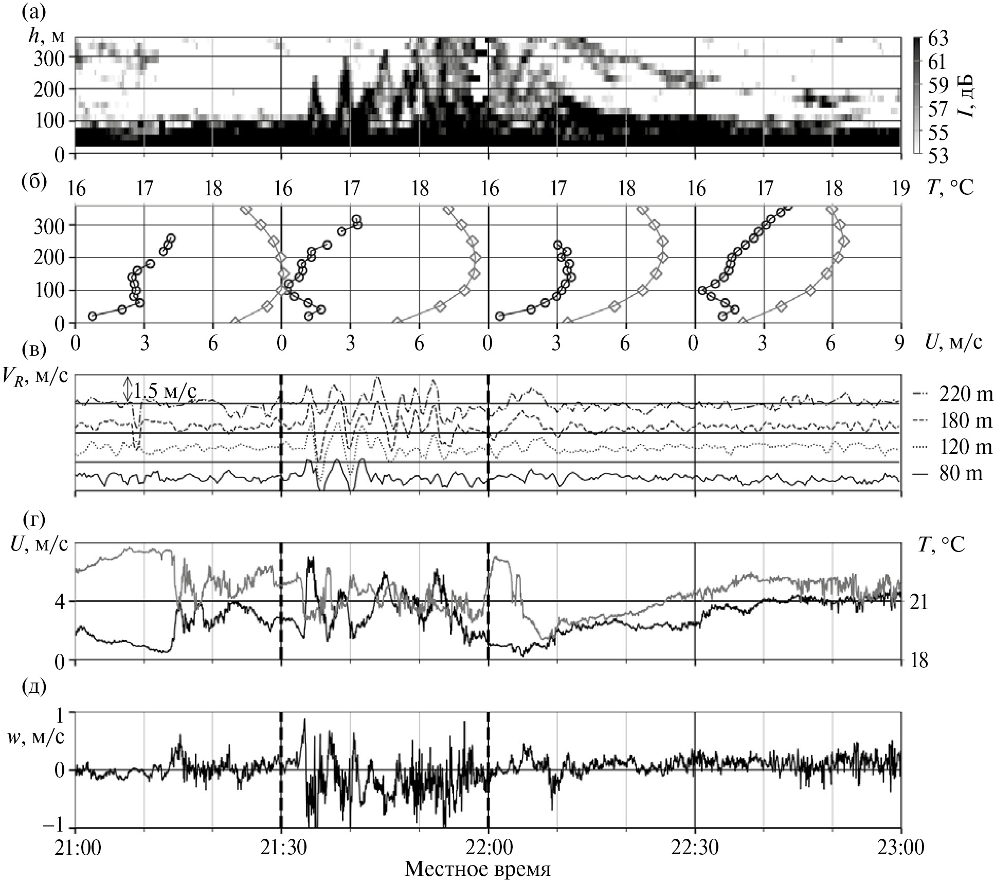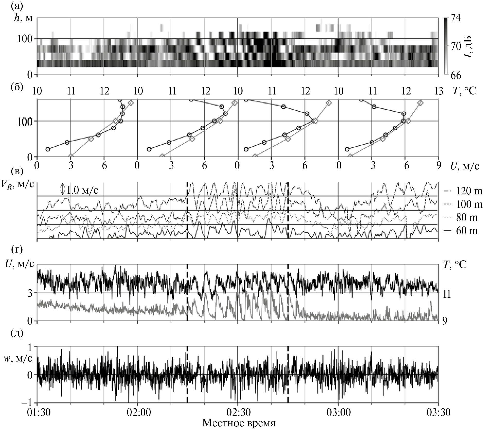 Рис. 1. Эпизод ВГСВ 24.04.2012. (а) Содарная эхограмма. (б) профили средней скорости ветра (чёрные линии, нижняя ось абсцисс) и температуры (серые линии, верхняя ось абсцисс). Время осреднения 30 минут. (в) радиальная скорость ветра по измерениям наклонной антенны на высотах 60, 80, 100 и 120 м. Временные ряды были сдвинуты относительно друг друга для наглядности. (г) горизонтальная скорость ветра (черная линия) и акустическая температура (серая линия). (д) вертикальная скорость ветра. По оси абсцисс везде кроме (б) отложено местное время. Панели (г) и (д) построены по данным измерений соника (высота 56 м). Ко временным рядам эхо-сигнала и радиальной скорости (панели (а) и (в)) для наглядности было применено скользящее осреднение по 1 минуте. Вертикальными пунктирными линиями обозначено время начала и конца волнового цуга.