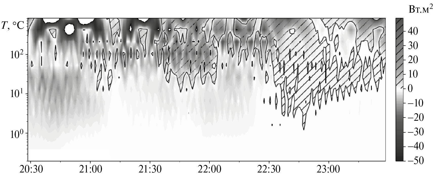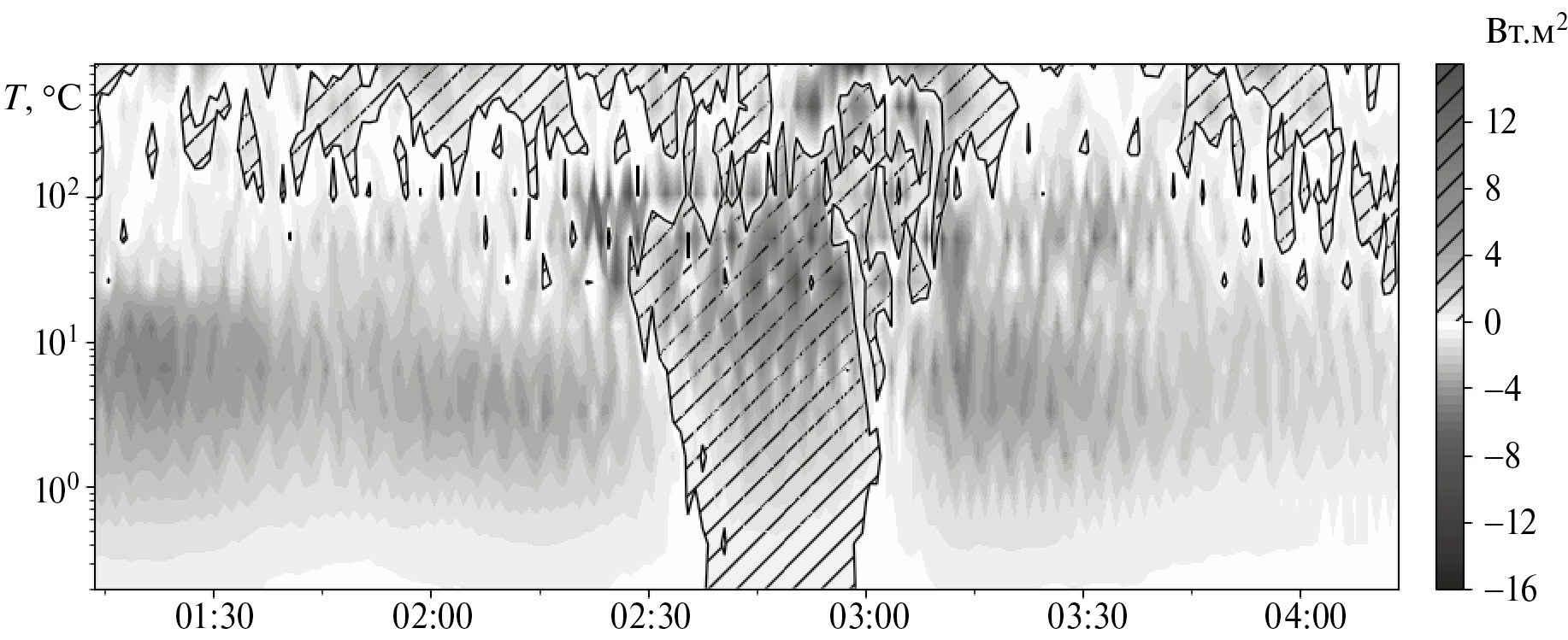 На рис. 5 представлено спектральное разложение потока тепла для рассматриваемого случая. До начала эпизода поток тепла принимал отрицательные значения почти на всех частотах, наибольший вклад вносили структуры с частотами менее ~0.005 Гц (масштабы более 200 с). После прихода цуга на частотах менее ~ 0.04 Гц (масштабы более ~ 25 с) знак потока сменился на положительный. В это же время вклад структур с более высокими частотами, сохранив отрицательные значения, снизился по абсолютным значениям. После окончания эпизода на всех частотах поток тепла постепенно снизился.