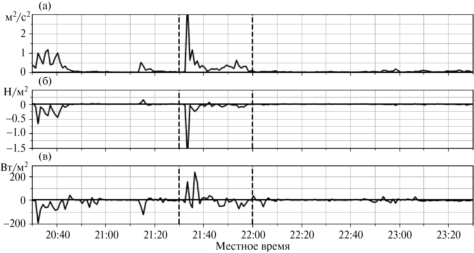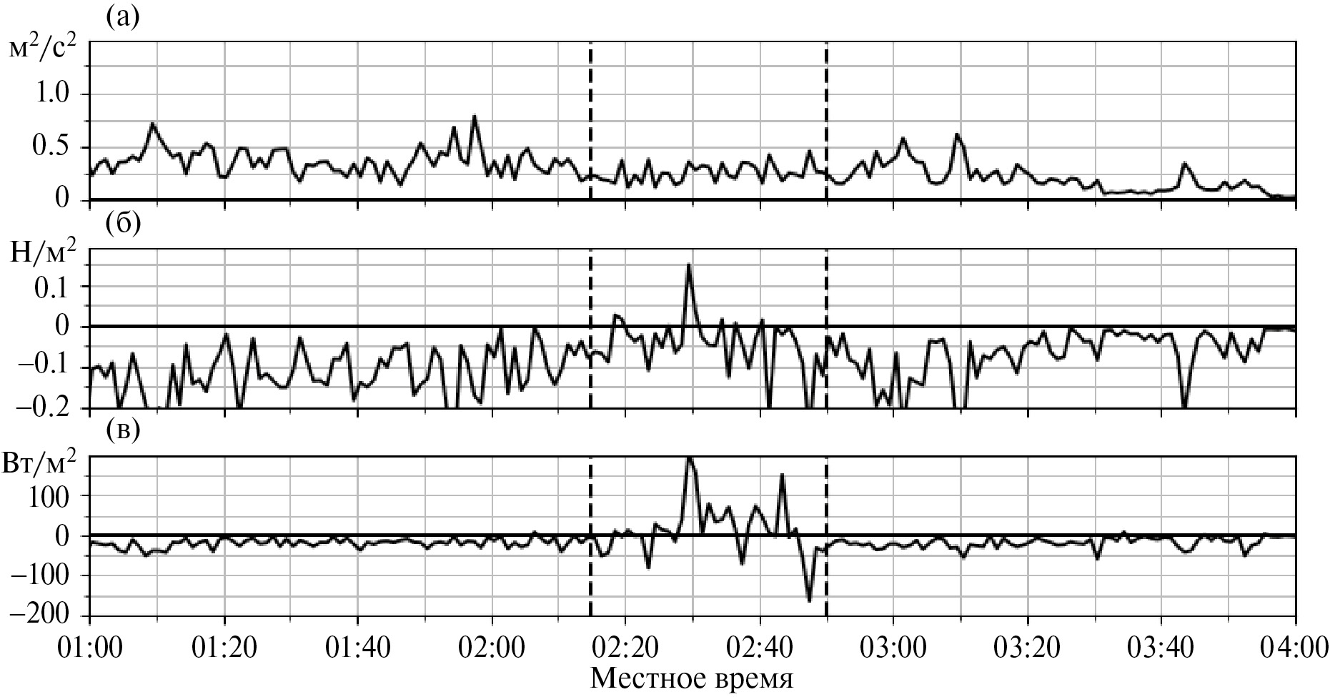 Рис. 3. Эпизод ВГСВ 24.04.2012. Временные ряды (а) ткэ, (б) потока импульса и (в) потока тепла, рассчитанные по данным измерений соника с осреднением в 1 минуту. Вертикальные линии указывают на время начала и окончания эпизода.
