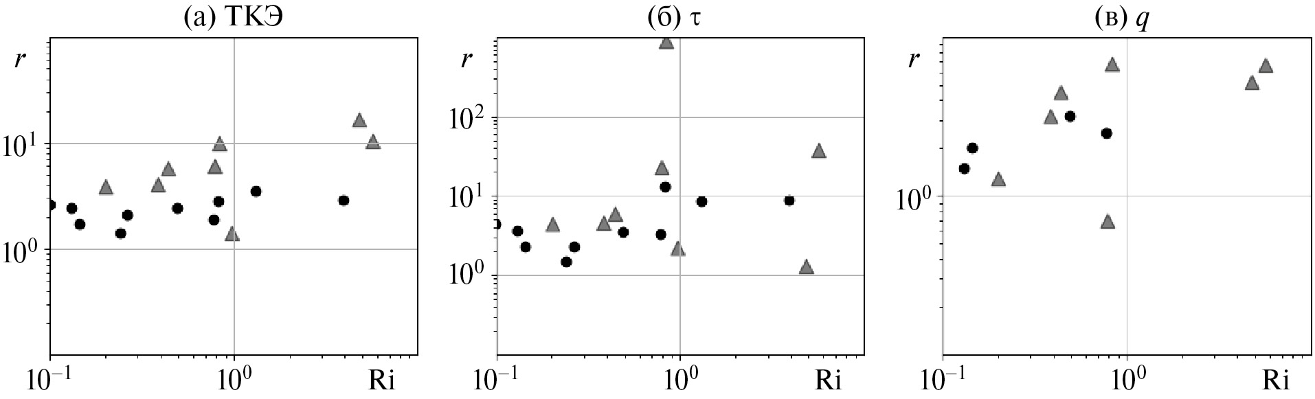 Рис. 7. Диаграмма рассеяния Ri и r для ткэ (а), q (б) и τ (в). Кружками отмечены значения для ВГСВ, треугольниками — для ВП.