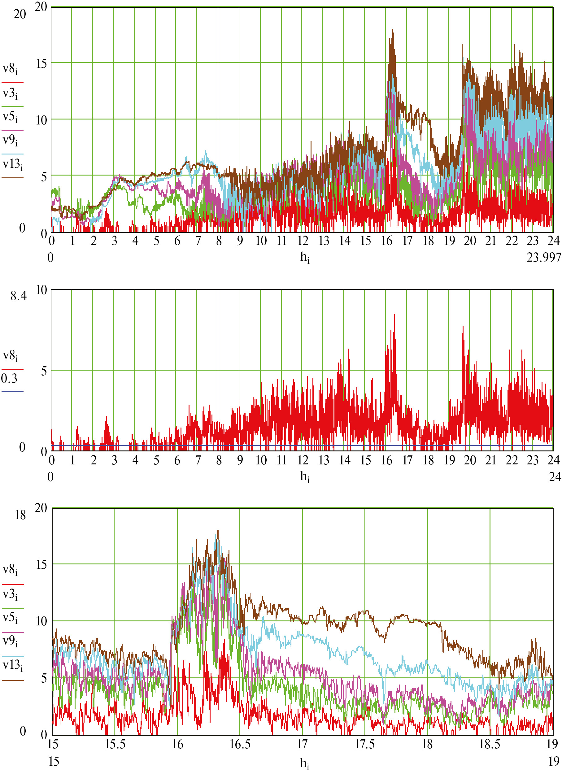 Рис. 7. Скорость ветра (м/с) на пяти высотах. v8 – скорость ветра на высоте 8 м. Остальные высоты те же, что для температуры воздуха (см. рис. 4).