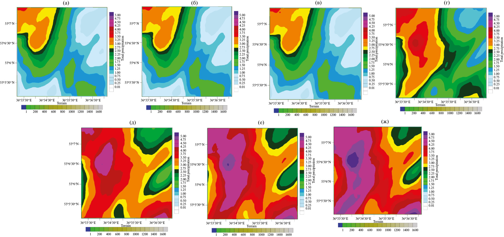 Рис. 16. Осадки – для 13:00(а), 13:10(б), 13:20(в), 13:30(г), 13:40(д), 13:50 (е), 14:00(ж) ВСВ; над районом измерений, вид сверху. ВММ располагается в центре области, координаты 55°06′42″ с. ш. 36°35′54″ в. д. Модифицированная модель WRF, 4 июля 2016 г. Шаг сетки 20 м.
