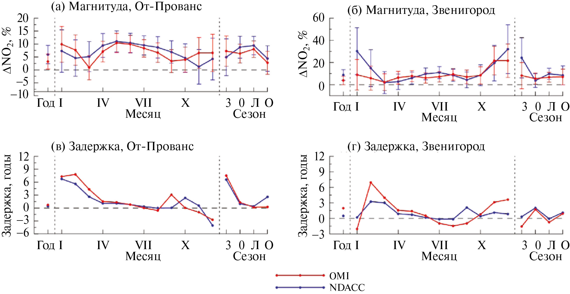 Фазовая задержка отклика NO₂ на ст. Звенигород обычно незначительно отличается от нуля (рис. 3г). Это характерно также для фазы отклика на ст. От-Прованс в течение трех сезонов с весны по осень (рис. 3в). Однако задержка в зимний сезон равна 6 мес. Таким образом, отклик NO₂ на воздействие 11-летнего СЦ в зимние сезоны От-Прованс находится примерно в противофазе с СЦ и с откликом NO₂ на ст. Звенигород.