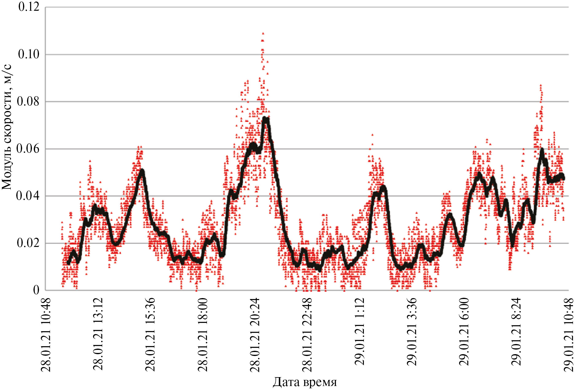 Колебания модуля скорости в течение суток, как показано на рис. 3, составляют от 0.01 до 0.08 м/с. Наблюдаемые изменения связаны с определенными фазами прохождения прямых и обратных волн, вызванных внутрисуточной неравномерностью попусков через КамГЭС [Luybimova et al., 2020].