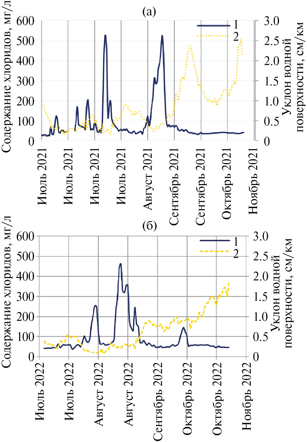 Рис. 7. Хронологические графики измеренных значений концентраций хлоридов в забираемой воде на водозаборе АО «БСЗ» (1) и уклона водной поверхности на рассматриваемом участке (2) в 2021 г. (а) и 2022 г. (б).