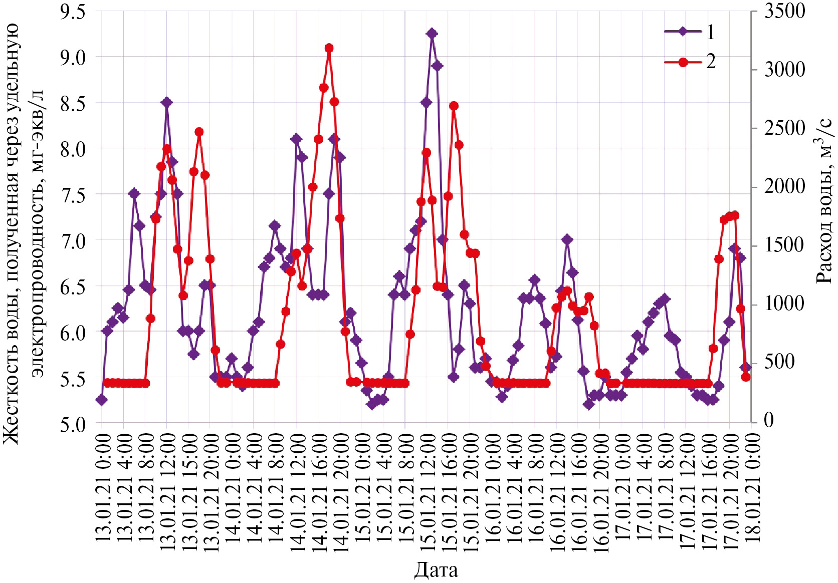 Рис. 4. Совмещенные хронологические графики расходов воды в нижний бьеф Камского гидроузла (2) и жесткости забираемой воды на ЧОС (1) (при существенной внутрисуточной неравномерности работы ГЭС).