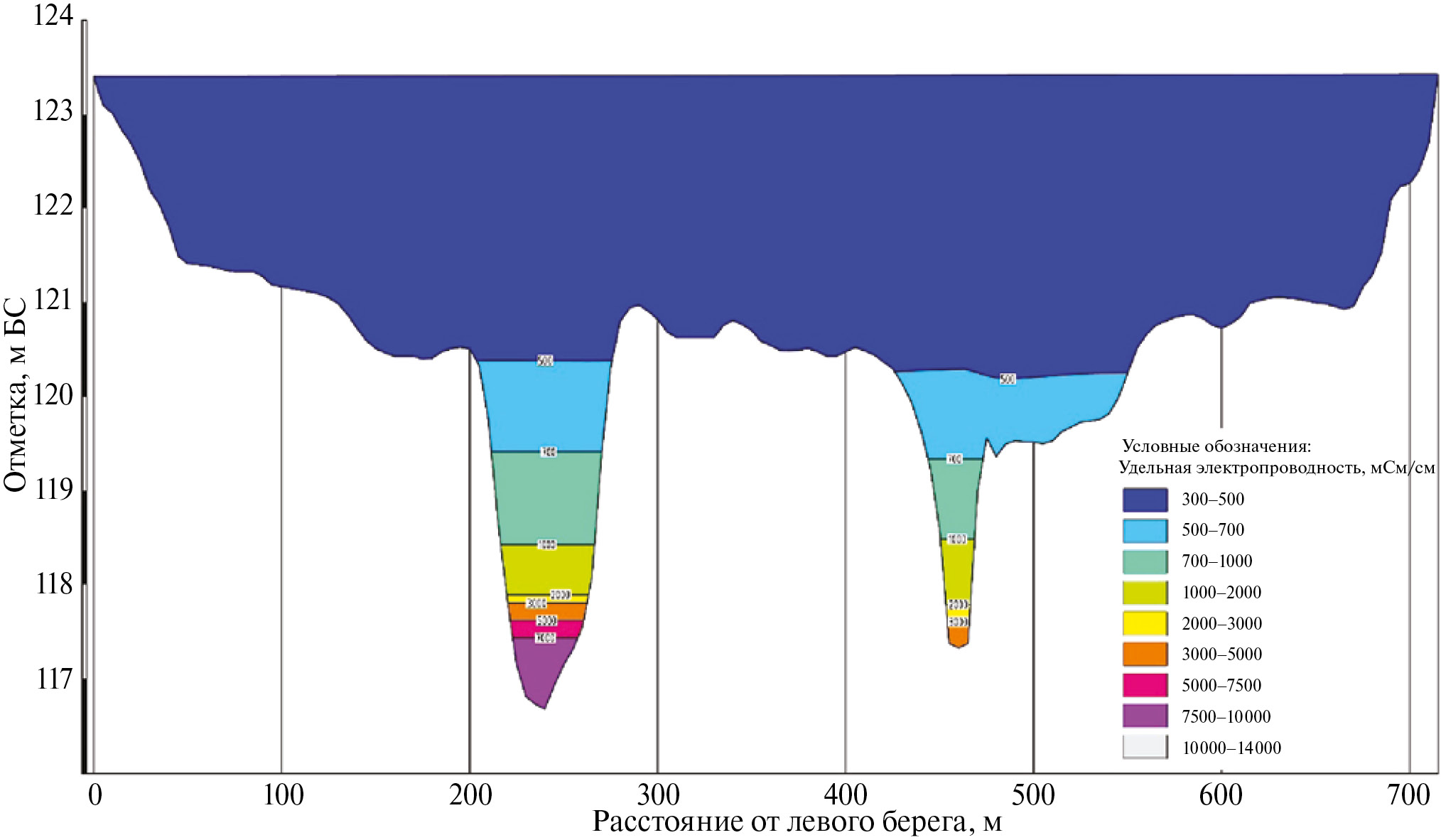 Рис. 5. Поперечный профиль распределения удельной электропроводности воды вдоль старого русла реки Зырянки.