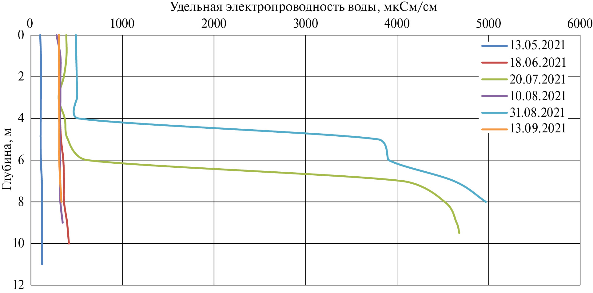 При этом так называемый «слой скачка» – граница раздела водных масс, на котором происходит резкое изменение регистрируемой величины (электропроводности), находится на одной глубине. Эта особенность водных масс является дополнительным фактором, способствующим формированию устойчивой вертикальной стратификации.
