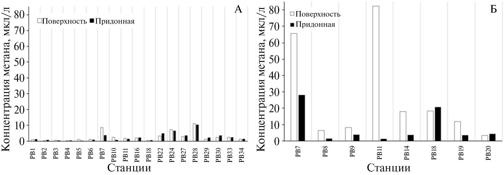 Рис. 9. Содержание метана на станциях измерений в поверхностном и придонном горизонтах в осенний (А) и летний (Б) сезоны.