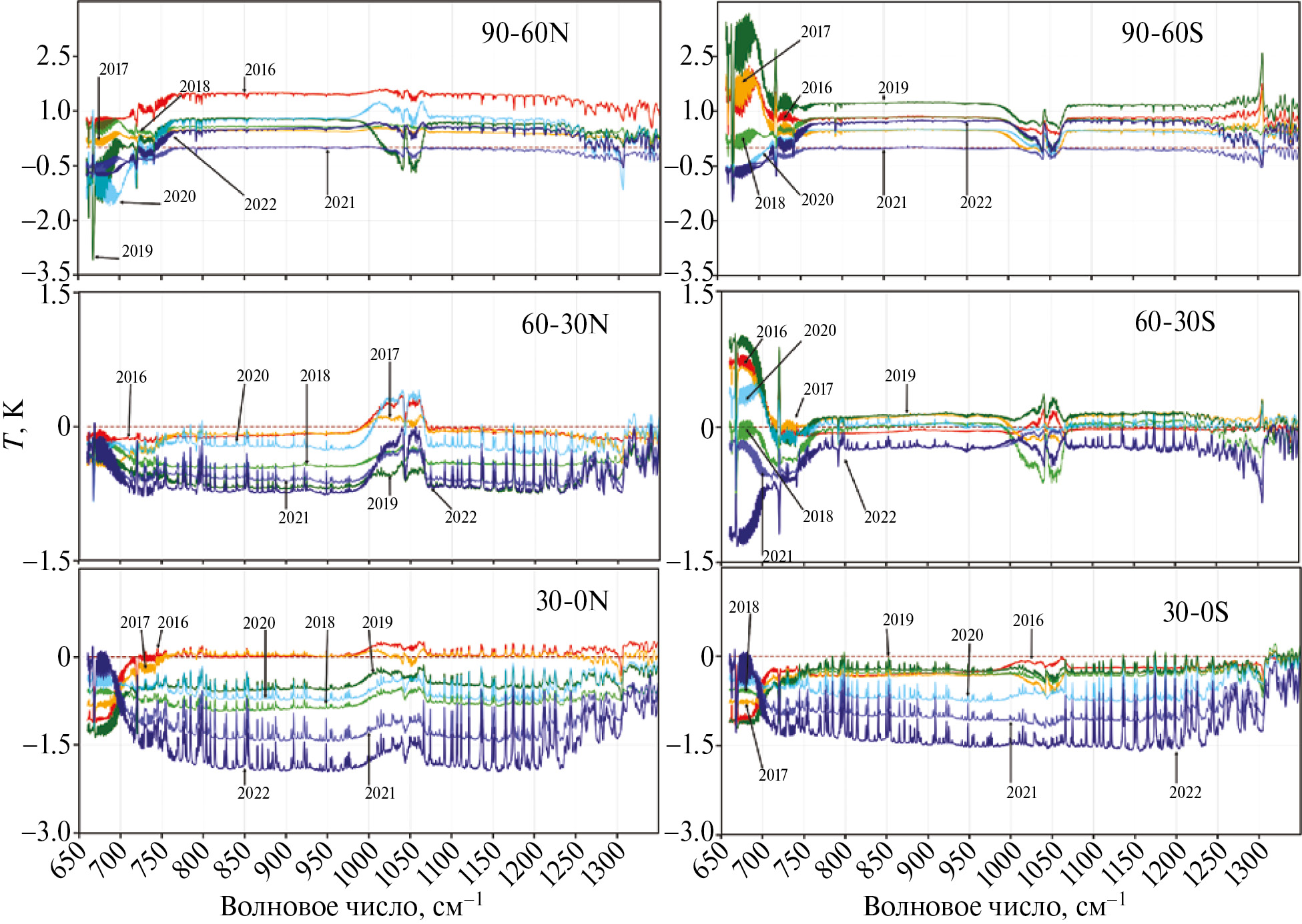 На рис. 5 представлены спектры разности среднего СИЗ для шести широтных зон за 2016–2022 гг. относительно 2015 г. на основе измерений ИКФС-2 для северного и южного полушарий. Приведенные данные демонстрируют сильно различающееся межгодовое изменение СИЗ по пространству. Это частично обусловлено широтными вариациями самих средних спектров СИЗ.