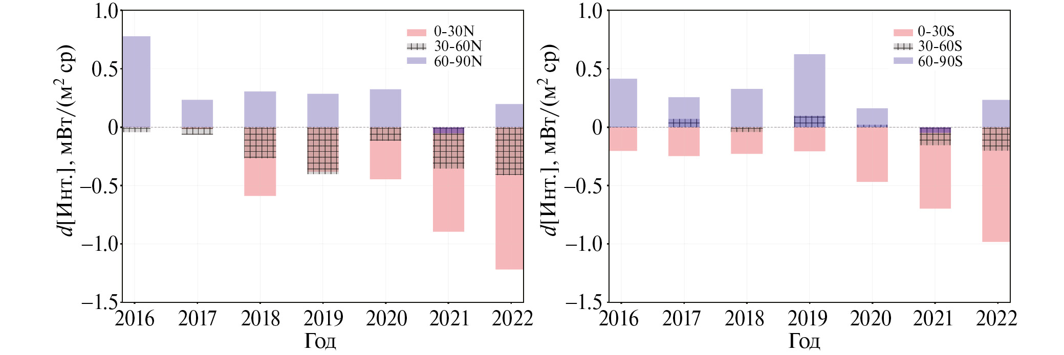 В тропиках обоих полушарий (0°–30°) наблюдаются наибольшие вариации СИЗ (до ~3 мВт м-2 см-1 ср). Разности преимущественно отрицательные, что говорит о меньших значениях СИЗ в период с 2016 по 2022 гг. по сравнению с 2015 г. В этих областях наблюдается выраженное постепенное уменьшение СИЗ с 2019 до 2022 гг.