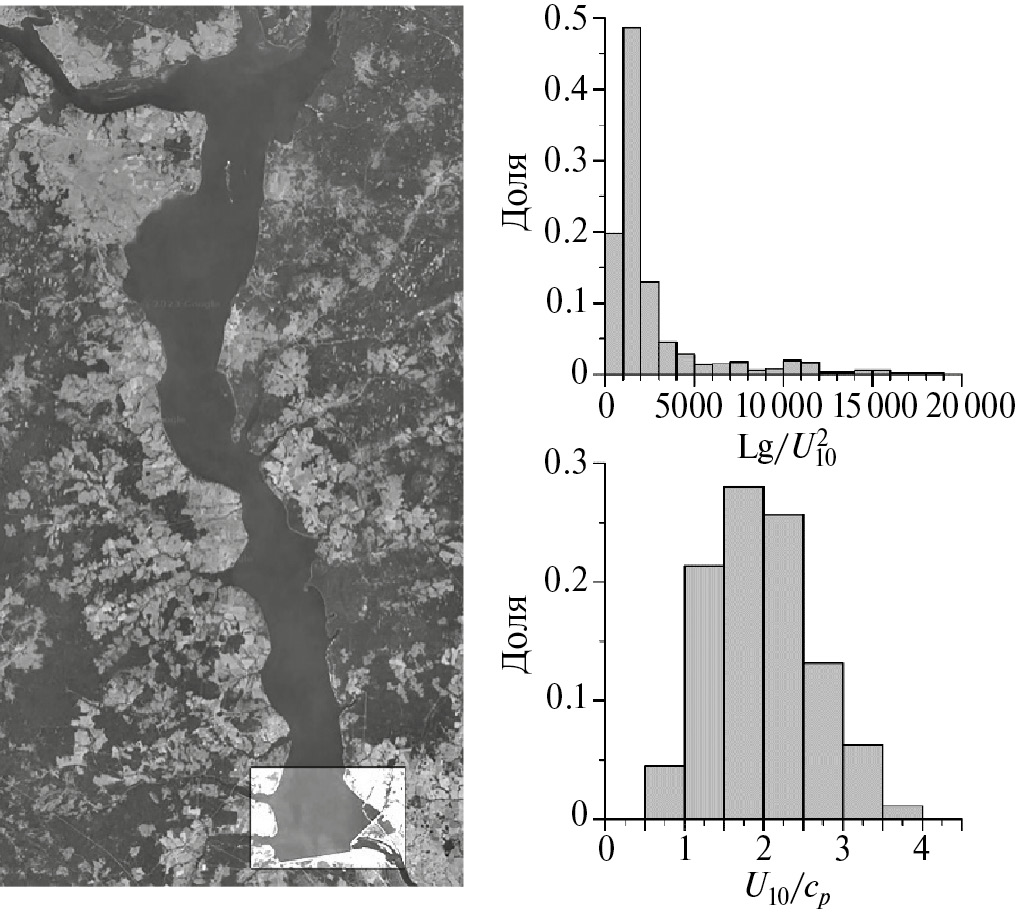 Рис. 1. (а) Общий вид Горьковского водохранилища. Светлым показана область проведения экспериментов. (б) Распределение наблюдаемых в эксперименте значений безразмерного разгона волн (сверху) и обратного возраста волнения (снизу)