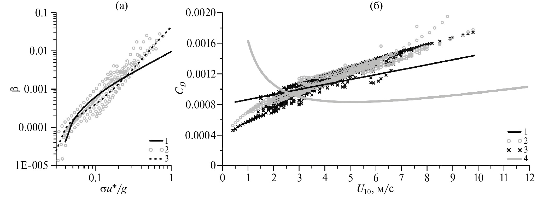 Рис. 3. (а) Зависимости коэффициента взаимодействия ветра и волн от безразмерной скорости трения ветра для параметризации. (б) Зависимости коэффициента аэродинамического сопротивления поверхности CD от скорости ветра U10. 1 – WAM 3, 2 – Tolman & Chalikov, 3 – WAM4, 4 – предложенная параметризация (3)