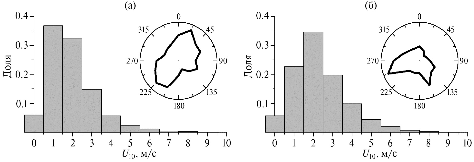 Рис. 6. Статистическое распределение направлений и скоростей ветра, усредненных за 2010–2015 гг. в навигационный период (с 10 мая по 31 октября): (а) Волжская ГМО, (б) Юрьевец
